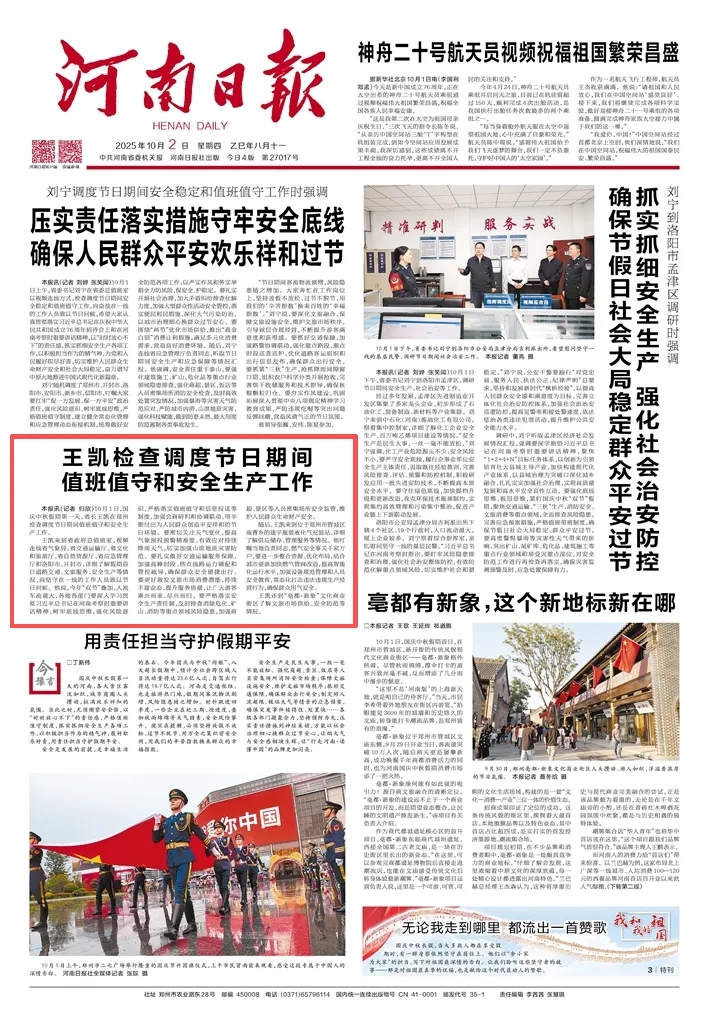 王凱來到省政府總值班室,視頻連線省氣象局、省交通運輸廳、省文化和旅游廳、省自然資源廳、省應急管理廳和洛陽市、開封市,詳細了解假期首日道路交通、文旅服務、安全生產(chǎn)等情況,向堅守在一線的工作人員致以節(jié)日問候。他說,今年“雙節(jié)”疊加,人流車流量大,各地各部門要深入學習貫徹習近平總書記在河南考察時重要講話精神,樹牢底線思維,強化風險意識,嚴格落實值班值守和信息報送等制度,加強會商研判和協(xié)調(diào)聯(lián)動,用辛勤付出為人民群眾創(chuàng)造平安祥和的節(jié)日環(huán)境。要密切關注天氣變化,提高氣象預報預警精準度,有效應對持續(xù)降雨天氣,切實加強山洪地質(zhì)災害防范。要扎實做好交通運輸服務保障,加強高峰時段、熱點線路運力調(diào)配和管控疏導,確保群眾安全便捷出行。要更好激發(fā)文旅市場消費潛能,持續(xù)豐富業(yè)態(tài),提升服務質(zhì)量,讓廣大游客乘興而來、盡興而歸。要嚴格落實安全生產(chǎn)責任制,及時排查消除?;?、礦山、消防等重點領域風險隱患,加強商超、景區(qū)等人員密集場所安全監(jiān)管,維護人民群眾生命財產(chǎn)安全。