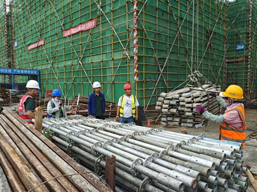 來到3樓頂板上方,工人們正搭建防護網(wǎng)。“他們是這個工作面的開荒者,危險系數(shù)最大。”葉劉杰說,只有防護網(wǎng)搭建完畢,木工、鋼筋工等不同班組才能陸續(xù)入場施工。仔細查看每道工序,并對當班工人叮囑一番注意事項后,葉劉杰才放心離開。